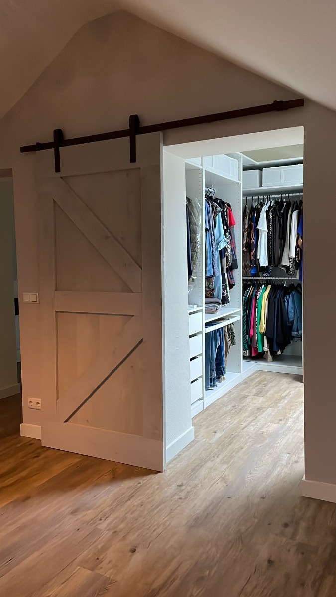 Ook voor een walk-in closet biedt een schuifdeur extra privacy. Je kunt de deur sluiten en zo je kledingruimte netjes uit het zicht houden, terwijl je toch gemakkelijk toegang hebt wanneer je dat nodig hebt.
