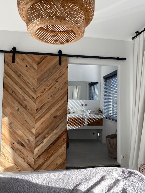 Een houten schuifdeur geeft je slaapkamer een natuurlijke en warme uitstraling. Stalen deuren met glas voegen een stoere, industriële look toe, terwijl ze ook licht doorlaten. Glazen schuifdeuren zijn perfect als je een open, lichte sfeer wilt creëren, bijvoorbeeld bij een garderobe of walk-in closet.
